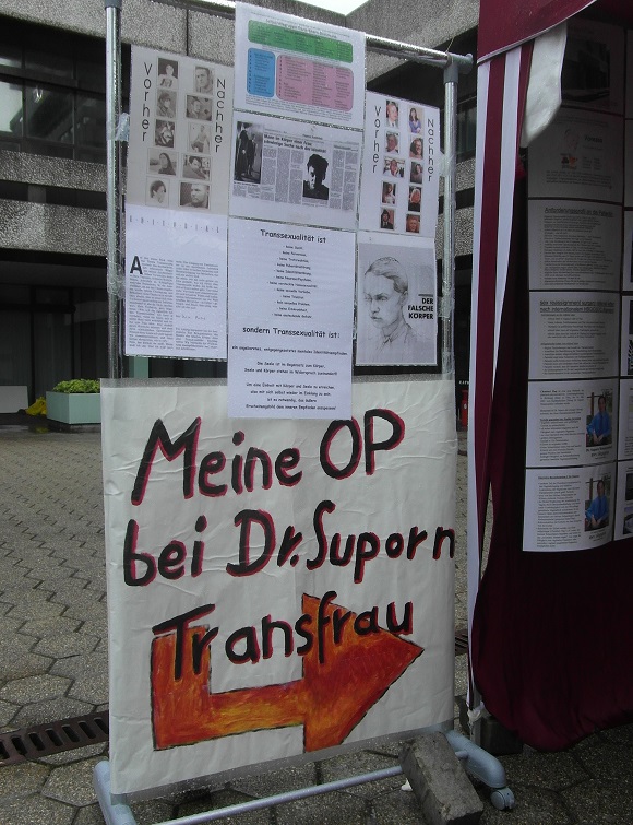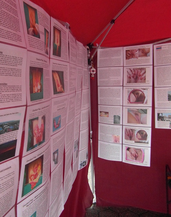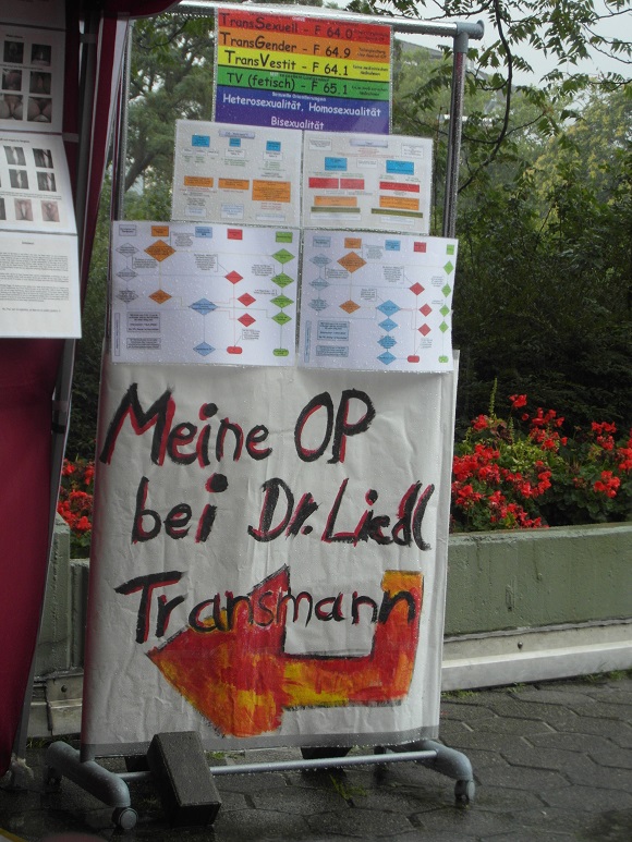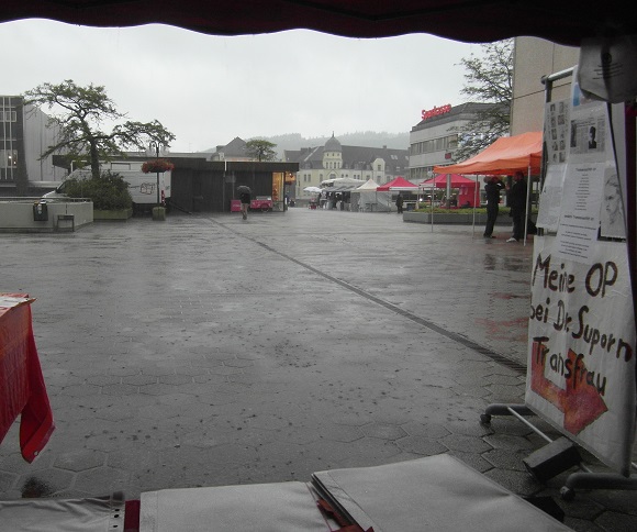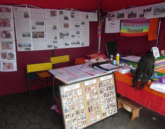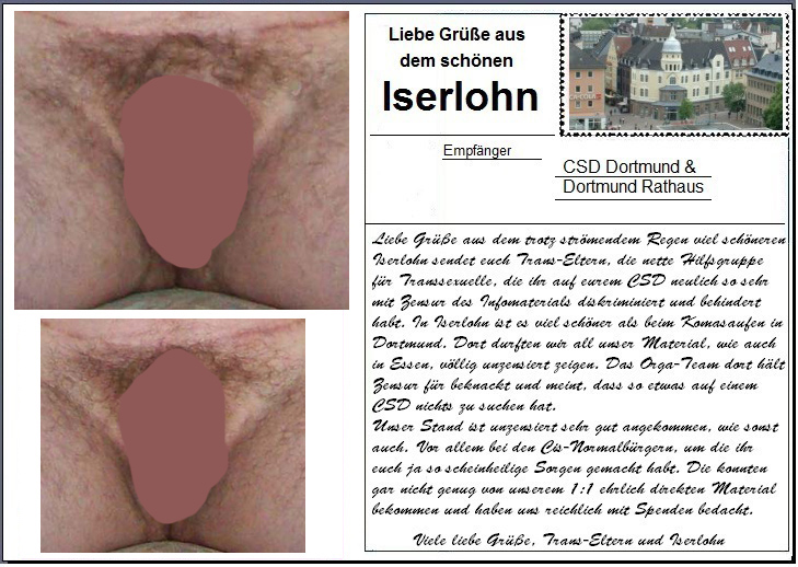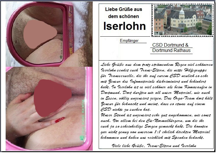 Iserlohn hat uns übrigens nicht zensiert, die fanden das super Scheiße vom Slado, denn das ist alles 1a Aufklärungsmaterial, sowas zensiert man nicht. Und unzensiert zog unser Stand auch wieder jede Menge Besucher. Wobei, viele waren nicht da, bei dem Sauwetter, aber davon sehr viele waren bei uns. Und wieder waren gerade die Cis-Normalbürger total interessiert an unseren Genital-OP Bildern, wieder wohl wissend, dass man sowas sonst nirgends zu sehen kriegt. Wir waren noch nicht annähernd mit Aufbau fertig, da waren die Bilder schon wieder heiß besucht...