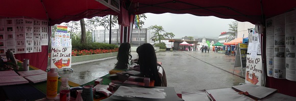 Nur das Wetter wurde immer mieser statt besser. So kamen jetzt auch Leute, um sich einfach nur unterzustellen. Und langsam weichte sogar schon das Dach der Pavillons durch, sodass alles innen drin zunehmend feinem aber fleißigem Sprühregen von oben ausgesetzt war...