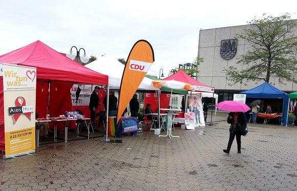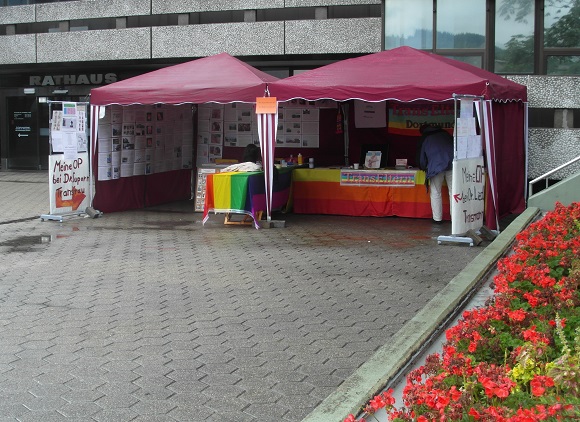 Iserlohn ist ein schöner Abschluss für eine CSD Saison, was man vom Wetter heute leider kaum sagen kann. Wie man sieht, nach wie vor wetterbedingt absoluter Notaufbau. Unsere Kollage steht so gut geht trocken, wird da aber nicht annähernd so beachtet, wie wenn sie vorne vor steht, das Bänkchen für die ermordete NGS-Frauen Liste steht verwaist unter dem Tapeziertisch. Später haben wir das Projekt vorne in den Regen auf den Tisch gelegt, ist ja schließlich laminiert. Aber insgesamt mussten wir heute auch mal an unser Material denken. Alles noch wetterfester zu machen, wird eine Hauptaufgabe zur nächsten Saison...