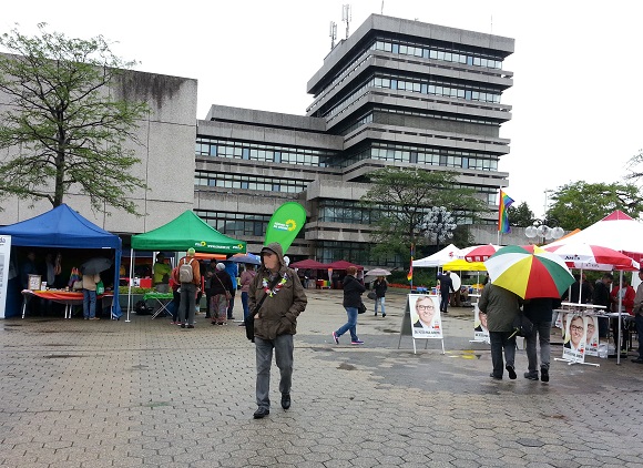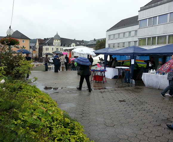 Schön zu sehen in den Pfützen, wie kräftig es regnet, und gegenüber auch, vor der dunklen Wand sieht man, es regnet Bindfäden. Da fehlen auch schon zwei Stände, Linke und SPD sind Schönwetter-Warmduscher.