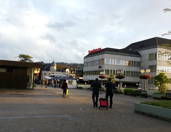 Warten, dass der Regen irgendwann mal aufhört, denn im Moment kommt gar niemand mehr vorbei, der Pavillon weicht durch, und da der Schillerplatz in Iserlohn nur nach Pflasterstein mit Fugen aussieht, aber in Wahrheit ist alles samt Fugen Beton, macht sich eine richtige Seenlandschaft breit...