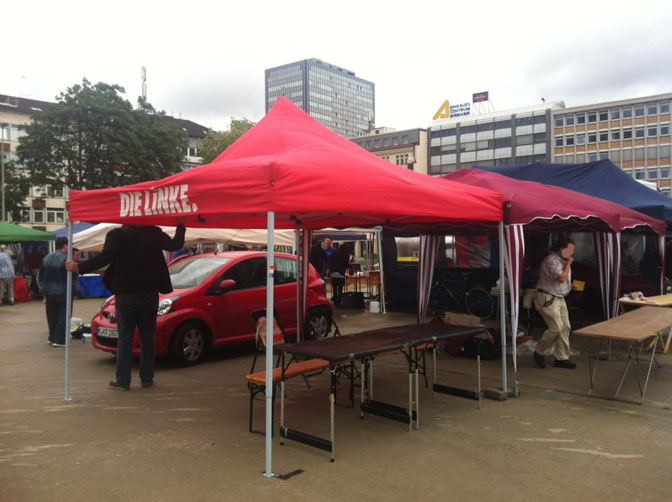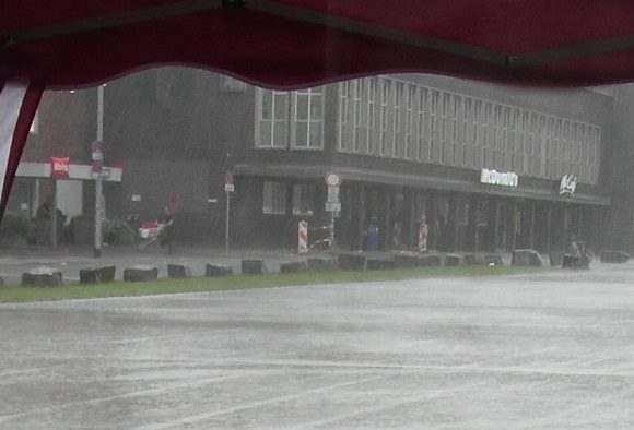 25.07.15: CSD Duisburg und gleichzeitig unsere persönliche Eröffnung der diesjährigen CSD-Saison. Sie ist nur leider sprichwörtlich ins Wasser gefallen. Es hat Bindfäden geregnet und wir mußten eine ganze geschlagene Stunde unsere Pavillons festhalten, sonst wären sie weggeflogen. Ergebnis: Unsere Ausrüstung, über 100 kg, klatschnass und der Katastrophenschutz hat die Veranstaltung wegen Unwetterwarnung komplett abgesagt. Also mußten wir unverichteter Dinge wieder nachhause. Und das wo wir im Vorfeld eine Menge für diesen CSD investiert haben, in Material und Geld. Nur gut, daß wir dieses Jahr in ein Laminiergerät und matte Laminierfolien (die spiegeln nicht, macht sich auf Fotos immer besser) investiert haben und so eine Menge unserer Infos für die Ewigkeit konserviert und regenfest gemacht haben. So muß nämlich nicht nochmal alles neu gedruckt werden, spart daher Zeit und eine Menge Geld. Dennoch, die Frustration war uns ins Gesicht geschrieben und wir ziehen aus diesem Erlebnis unsere Konsequenzen und lernen daraus.
