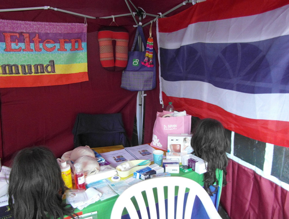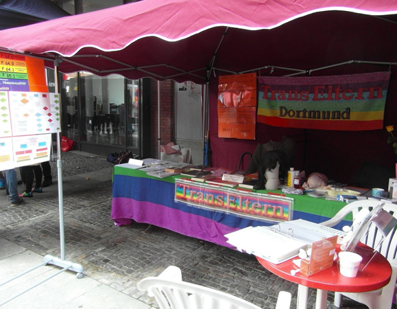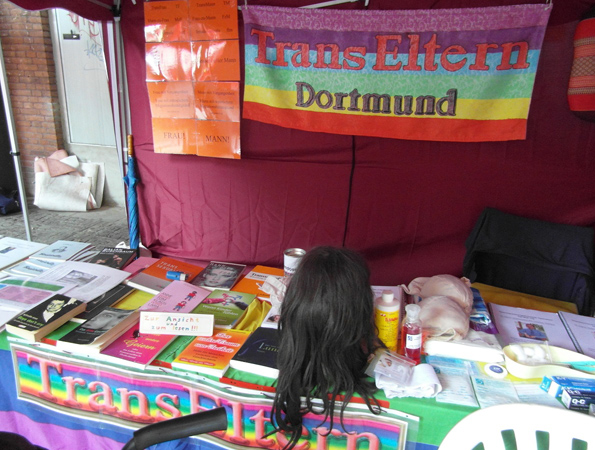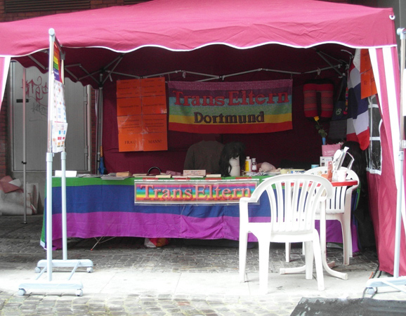 Da im Vorfeld die Email-Kommunikation nicht geklappt hatte (Fehler auf dem Server), was wir aber nicht bemerkt hatten, da die Mails als "angekommen" angezeigt wurden, erschienen wir für die Verantwortlichen dort doch sehr spontan. Sicherheitshalber haben wir während der Fahrt nach Münster telefonisch nochmal nachgehakt. Man merkte förmlich, daß man uns dort nicht haben wollte, zumindest der Gesprächspartner am Telefon. Ein Abwimmelungsversuch nach dem anderen folgte am Telefon. Es wäre alles aufgebaut und man dürfe mit dem Auto nicht mehr reinfahren (was sich später als dreiste Lüge herausgestellt hatte, da wir noch früh genug angekommen sind, aber da hatten wir schon zu Fuß die ganze Ausrüstung durch die halbe Stadt geschleppt - Danke für die Mitschlepphilfe einiger dort bereits anwesender Betroffener). Als wir dann dort angekommen sind, empfing uns der Telefongesprächspartner und meinte, wir können direkt wieder nach Hause, es sei kein Platz mehr frei. Daraufhin fragte eine Mitfahrerin was das denn für eine Ausrede sei, dahinten sei noch genug Platz, seine Antwort war, daß das eine Sicherheitszone sei (was als solche aber nicht ausgeschildert war!). Dann sagte ich, daß ich mit einem Verantwortlichen des CSD's sprechen wolle, bräuchte ich nicht, denn der hätte eh keine Zeit. Wenige Sekunden später fand ich einen Verantwortlichen, erklärte die Lage (Mailkommunikation technischerseits unerkannt fehlerhaft) und keine 15 min. später waren wir am aufbauen, ein politischer Stand hatte abgesagt und so war doch noch ein Platz frei. Sogar sehr wetter- und windgeschützt. Perfekt.